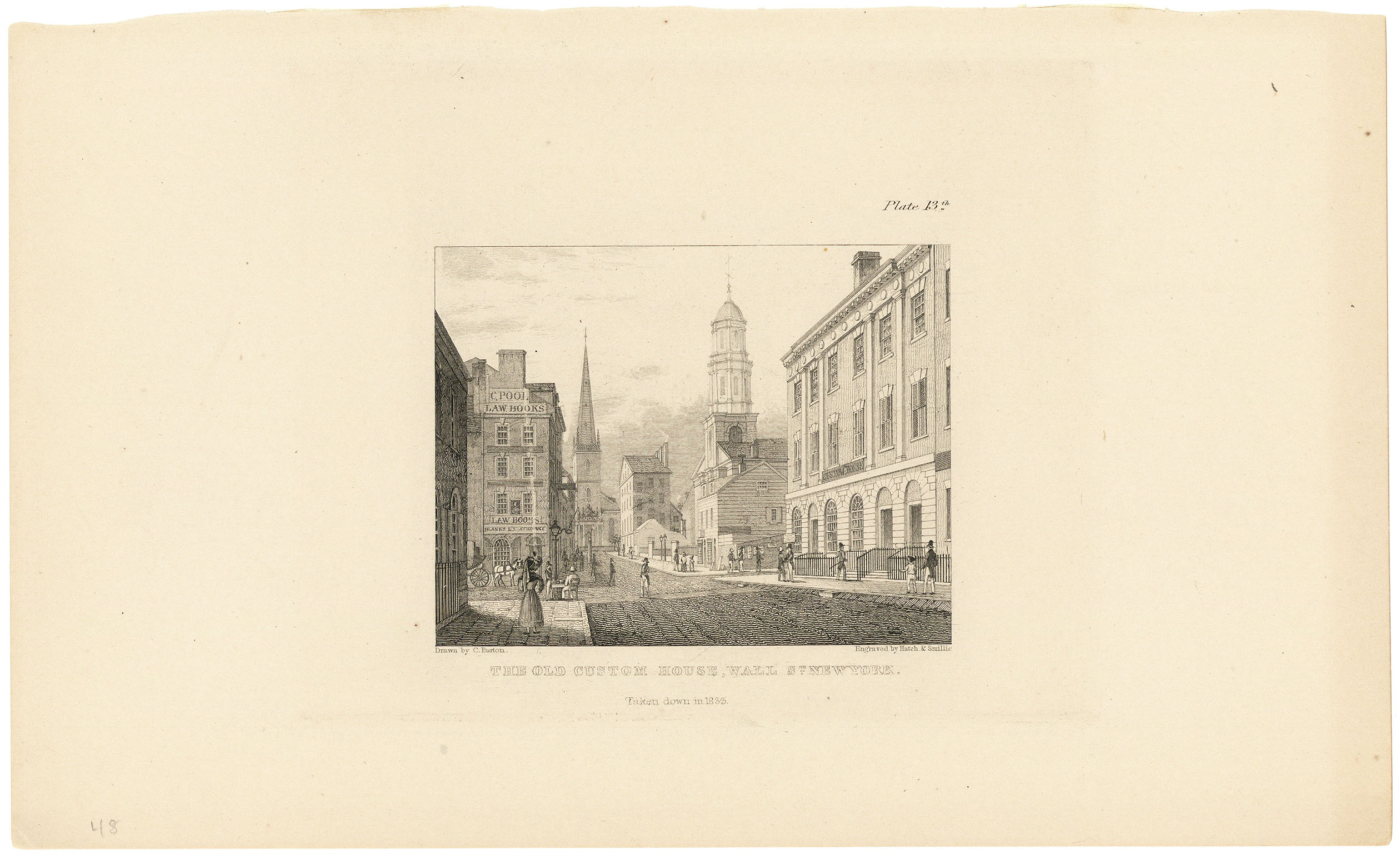 DESCRIPTION: This view of the Old Custom House on Wall Street was originally part of the "Bourne Views of New York" series and later reissued by John Disturnell after acquiring the original printing plates. The engraving captures the stately neoclassical facade of the Custom House, a hub of maritime trade and federal activity in 19th-century New York.