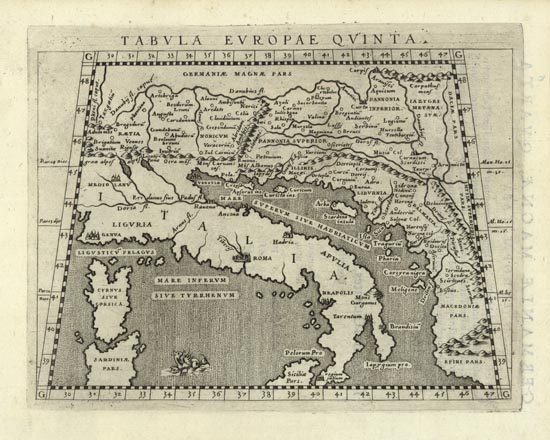 DESCRIPTION: A fine example of this Ptolemaic map of the Adriatic, Italy and the Balkans. This map appeared in "Geographiae Cl. Ptolemaei Pars Scounda" which was part of "Geographiae Universae...".