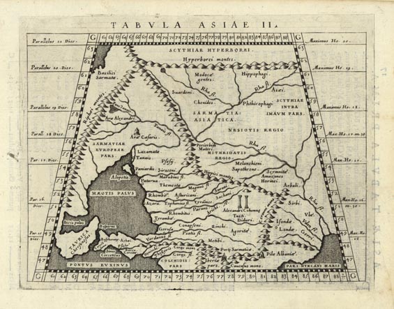 DESCRIPTION: A fine example of this Ptolemaic map showing Caucasus region from modern-day Ukrane, Crimea and Sea of Azov to the mouth of the Volga River and the Caspian Sea. This map appeared in Magini's"Geographiae Cl. Ptolemaei Pars Scounda" which was part of "Geographiae Universae...".