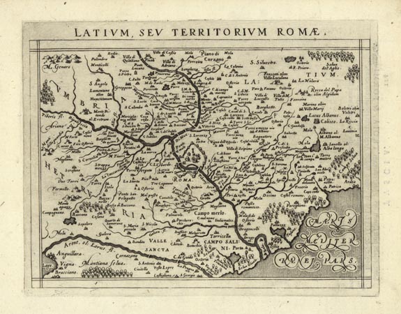 DESCRIPTION: A fine early map of the area around Rome. This map appeared in Magini's "Geographiae Universae...". Engraved by the Italian master enngraver Girolamo Porro. Several sea monsters are shown in the surrounding waters.