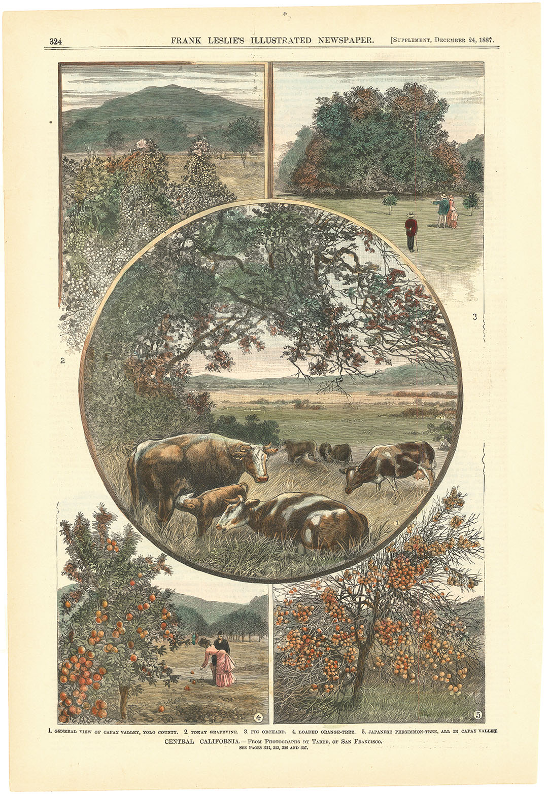 DESCRIPTION: A 19th-century perspective of Central California, captured as a wood engraving and hand colored to highlight the details.<br><br> Key text: "General view of Capay Valley, Yolo County. 2. Tokay Grapevine. 3. Fig Orchard. 4. Loaded Orange-Tree. 5. Japanese Persimmon-Tree, all in Capay Valley." From photographs by Taber, of San Francisco.