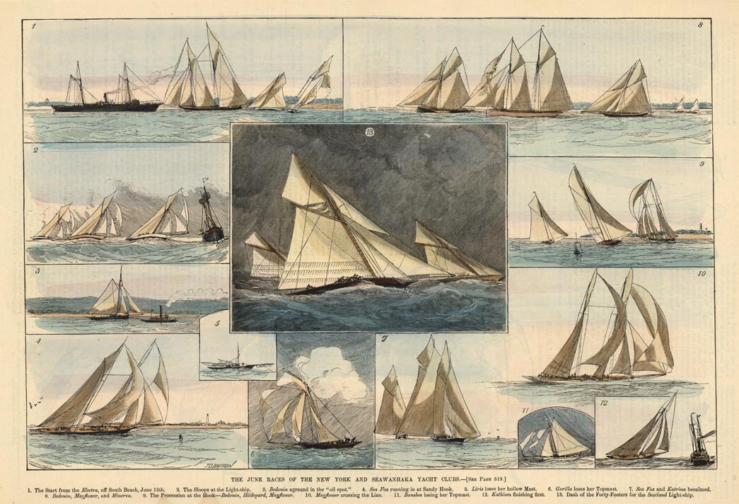 DESCRIPTION: This engraving contains 13 illustration of a sailing race around the area of South Beach, Staten Island (a borough of New York City ) and Sandy Hook, New Jersey. The Swawanhaka Yatch Club is located on Centre Island in Oyster Bay, Long Island.