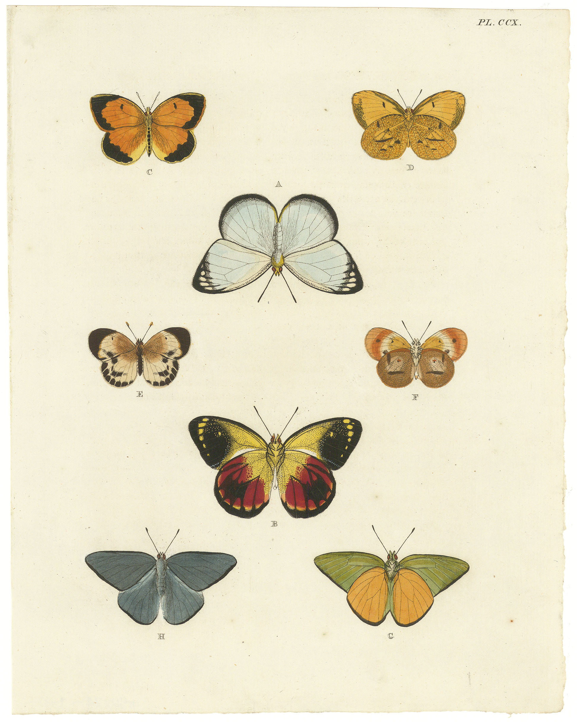 DESCRIPTION: Hyparere. (a.b.) c.d. Nicipee. e.f. Aretheusa. g.h. Liberia. Plate CCX. Pieter Cramer (1721–c.1779), a Dutch wool merchant and entomologist, assembled a remarkable collection of butterflies and moths that became the basis for one of the most important natural history publications of the 18th century. He hired Gerrit Wartenaar Lambertz to create drawings of his specimens, which were engraved and published in De Uitlandsche Kapellen Voorkomende in de Drie Waereld-Deele Asia, Africa en America… / Papillons Exotiques des Trois parties du Monde: l’Asie, l’Afrique et l’Amerique. Issued between 1775 and 1782, the work introduced readers to exotic Lepidoptera from across Asia, Africa, and the Americas, presented in finely engraved plates with original hand coloring. Plate CCX illustrates several butterflies under the names Hyparere, Nicipee, Aretheusa, and Liberia, arranged in upper and underside views, their intricate wing markings carefully rendered to convey both scientific accuracy and artistic refinement.