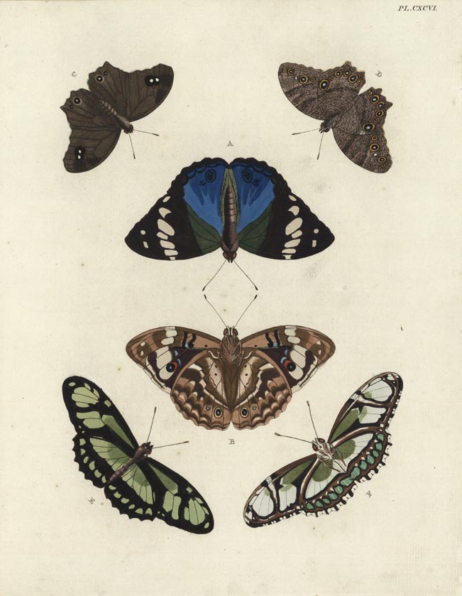 DESCRIPTION: Pl. CXCVI. Pieter Cramer (1721-c.1779) was a Dutch wool merchant and entomologist. He assembled an extensive collection on insects that included butterflies and moths. He hired Gerrit Wartenaar Lambertz to make drawings of his collection that he then had engraved and published. The resulting work was titled “De Uitlandsche Kapellen Voorkomende in de Drie Waereld-Deele Asia, Africa en America.../Papillons Exotiques des Trois parties du Monde: l'Asie, l'Afrique et l'Amerique” or the Exotic Butterflies from three parts of the World: Asia, Africa and America. They are high quality engravings with original hand coloring.