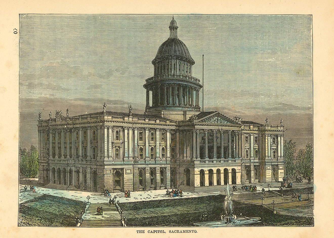 DESCRIPTION: A 19th-century perspective of Capitol, Sacramento, captured as a wood engraving and hand colored to highlight the details.