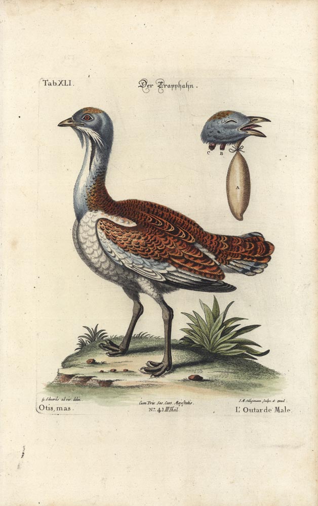 DESCRIPTION: From "Sammlung Verschiedener Auslandischer und Seltener Vogel." The series contains birds by Mark Catesby & George Edwards, and were engraved by Johann Michael Seligmann, printed by Johann Joseph Fleischmann. The series was published in Germany in nine parts between 1749 and 1776. The titles are printed in Germany, Latin and French.