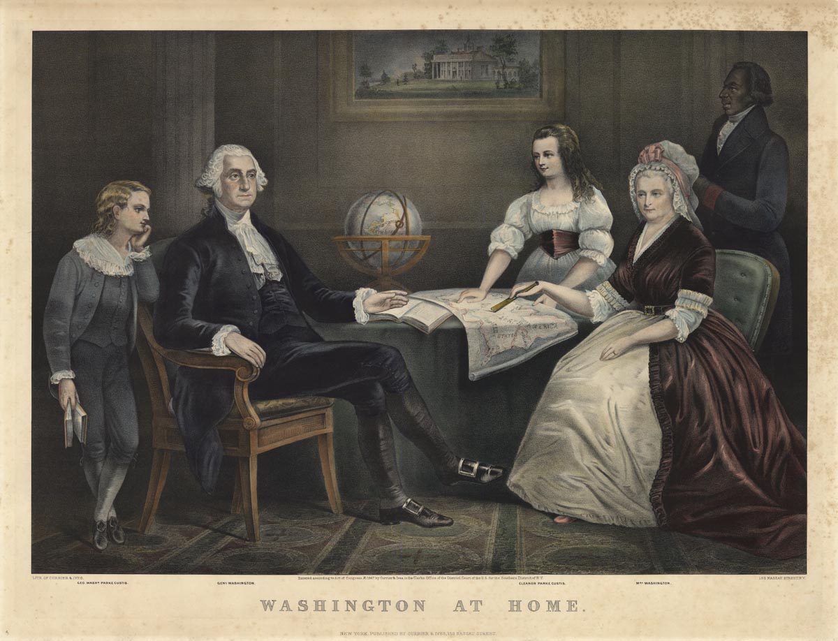 DESCRIPTION: From left to right "Geo. Washn. Parke Custis; Genl. Washington; Eleanor Park Custis; Mrs. Washington." Picture on wall of Mount Vernon, globe featuring North America and United States, map on table shows Eastern North America shows the state of Virginia.
