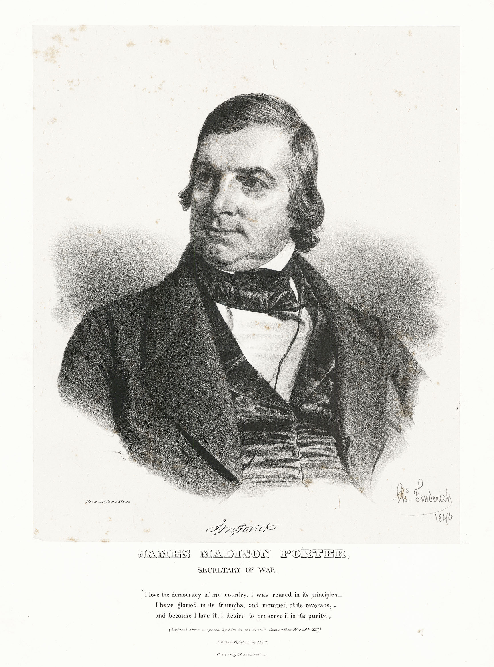 DESCRIPTION: This lithograph on chine-colle, signed and dated on stone in 1843, presents a striking portrait of James Madison Porter (1793–1862), the 18th United States Secretary of War and a founder of Lafayette College. Beneath the image is an excerpt from Porter's 1837 speech to the Pennsylvania Constitutional Convention: "I love the democracy of my country. I was reared in its principles- I have gloried in its triumphs, and mourned at its reverses;- and because I love it, I desire to preserve it in its purity." <br><br> Porter, a prominent figure in law, politics, and education, served briefly under President John Tyler as Secretary of War. Despite not being confirmed by the Senate, he made significant contributions to the War Department and later left a lasting legacy as a founder of Lafayette College. He was also the first president of the Delaware, Lehigh, Schuylkill, and Susquehanna Railroad that later became the Lehigh Valley Railroad.