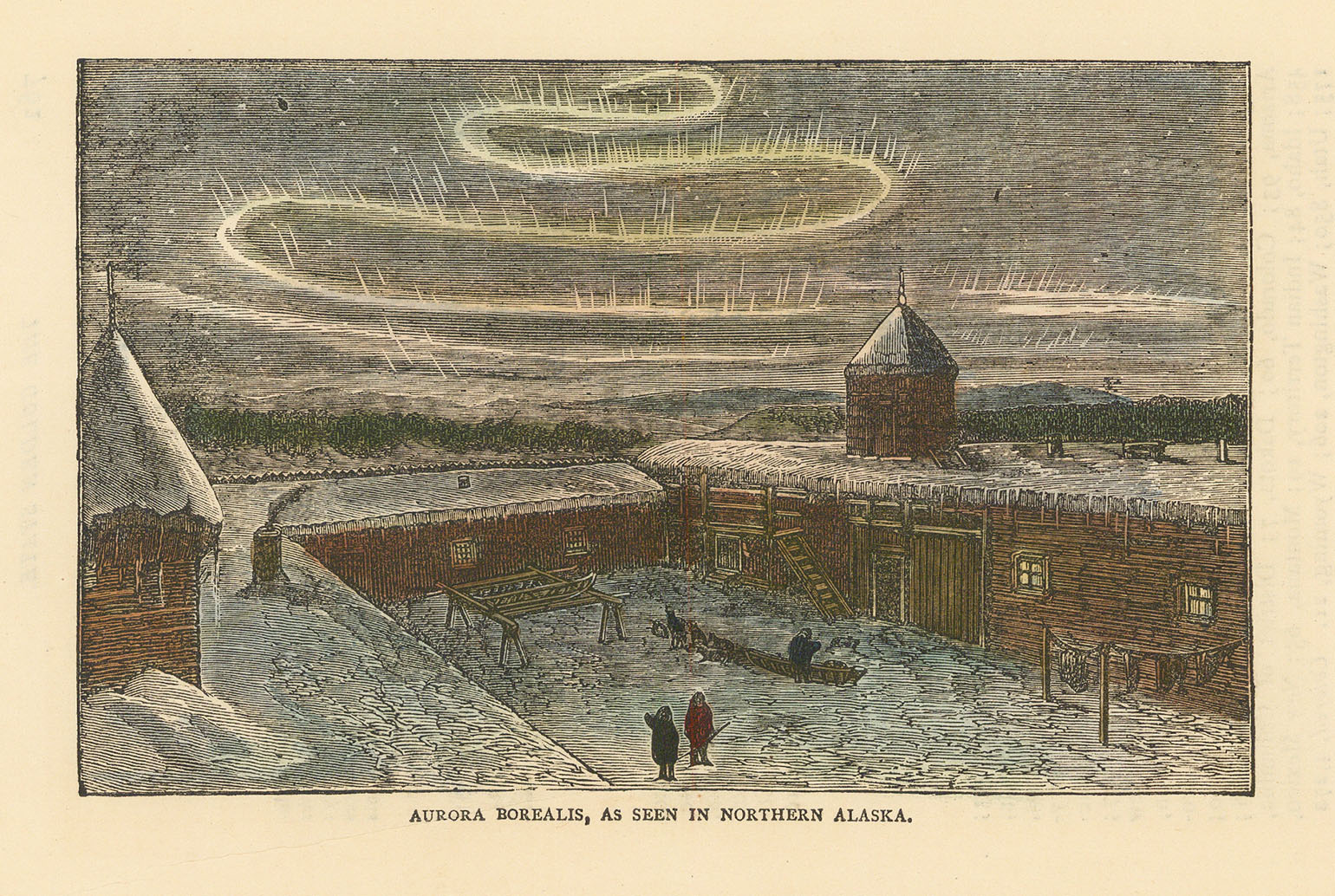 DESCRIPTION: A 19th-century perspective of the Aurora Borealis or northern lights, captured as a wood engraving and colorized to highlight the details.