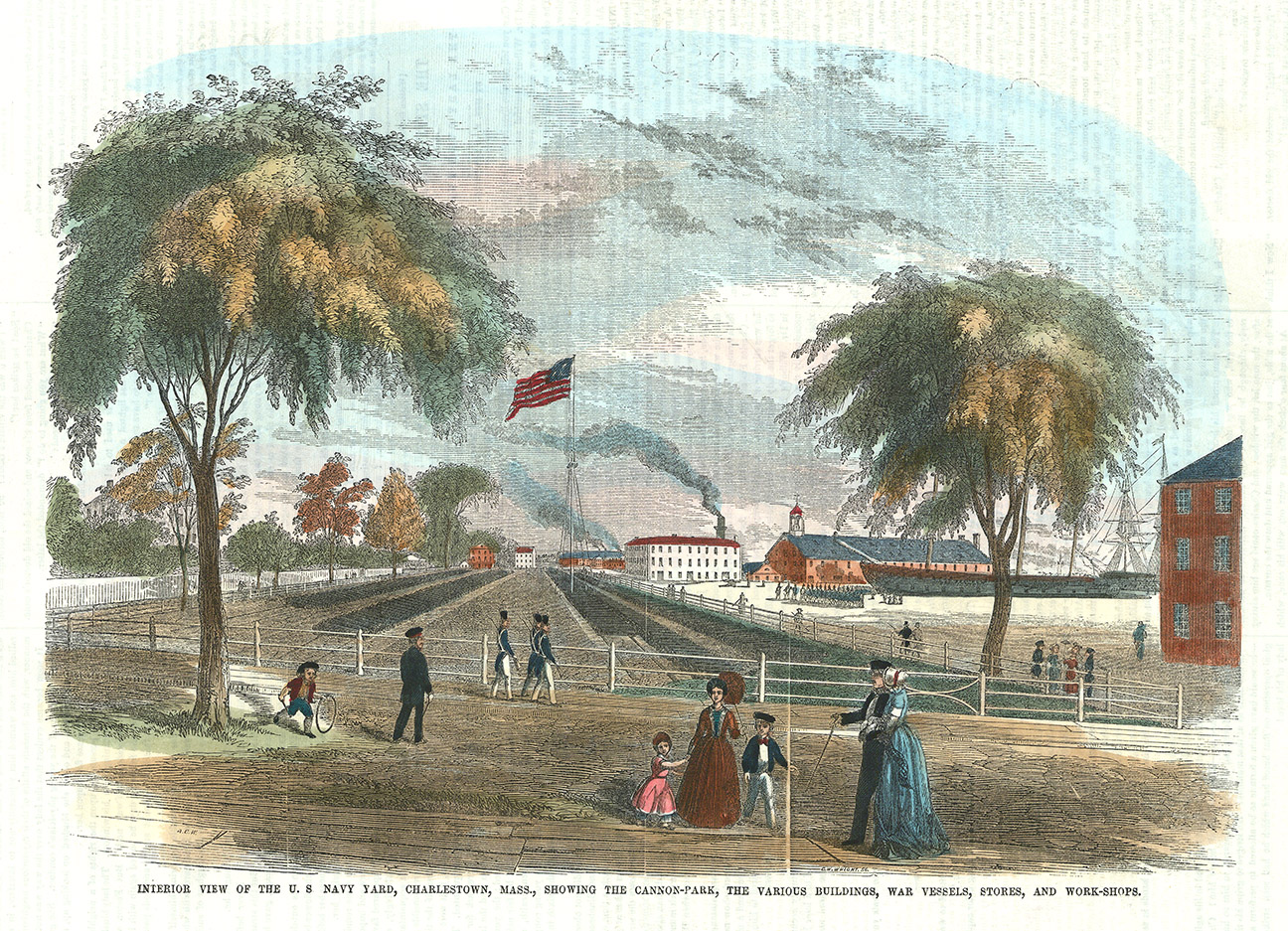 DESCRIPTION: A 19th-century depiction of the Interior View of the U.S. Navy Yard, Charlestown, Mass., showing the Cannon-Park, the various buildings, war vessels, stores, and workshops, captured as a wood engraving and handcolored to highlight the details.