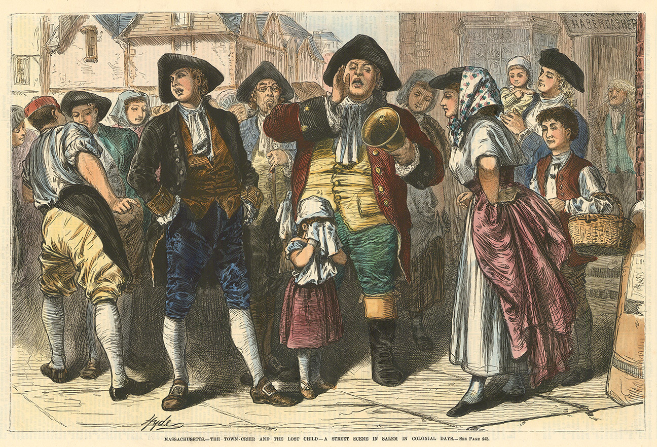 DESCRIPTION: A 19th-century depiction of "The Town-Crier and the Lost Child," captured as a wood engraving and handcolored to highlight the details. This imaginative scene shows a child lost and crying with adults of the town searching for the child's parent, a relatable scene akin to losing sight of your kid in the supermarket today!