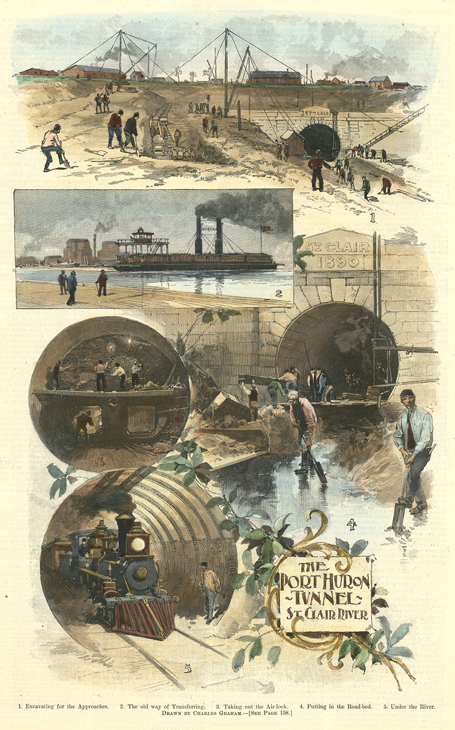 DESCRIPTION: A lively 19th-century composite of five scenes showcasing the construction of the Port Huron Tunnel under the St. Clair River. The scenes include "Excavating for the Approaches," "The Old Way of Transferring," "Taking Out the Air-lock," and "Putting in the Road-bed under the River," all brilliantly drawn by Charles Graham. Captured as a wood engraving and handcolored to bring the details to life, this piece highlights the excitement and ingenuity of the tunnel's creation.