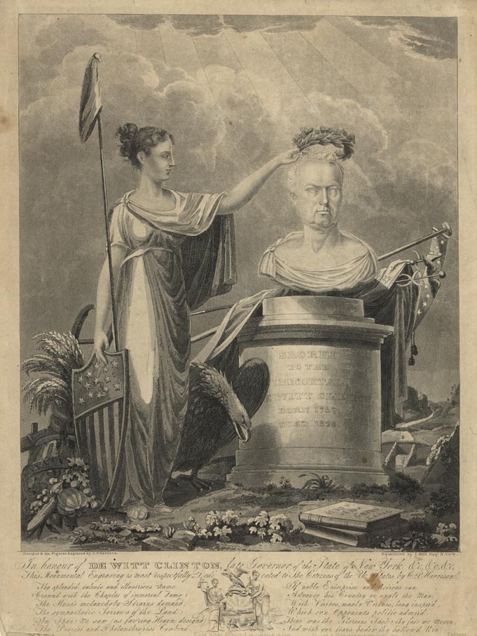 DESCRIPTION: Designed & the figures engraved by C. P. Harrison. Aquatinted by L. Hill Esqr. N. York. <br><br> America places a laurel upon the memorial of DeWitt Clinton. Beside her the bald eagle bows his head. The momument reads, 'Sacred to the Immortal De Witt Clinton / Born 1769. / Died 1828.' On the ground rests a book entitled, 'Hist. of the Grand Canal,' which refers to the Erie Canal. DeWitt began construction of the canal during his time as Governor, despite the heavy opposition it faced. When it opened in 1825 it was considered an engineering marvel and opened the way for faster, cheaper trade and transport.