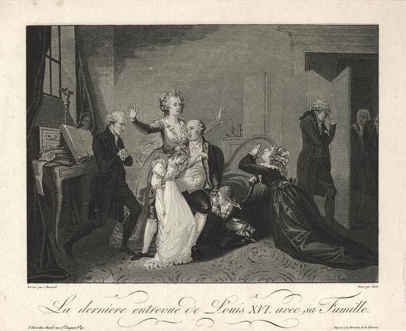 DESCRIPTION: Dessine par C. Benazeck. Grave par Jazet. This engraving captures the final moments King Louis XVI had with his family before facing execution on January 21, 1793. His people had placed him on trial and found him guilty of treason. His wife, Marie Antoinette, would meet the same fate in October and their son, George XVII, would perish in prison at the age of 10. The only survivor of the family was the daughter, Marie Therese, who would remain in prison until December of 1795 and spent most of her remaining life in exile. A priest on the left offers his final blessing to the king.