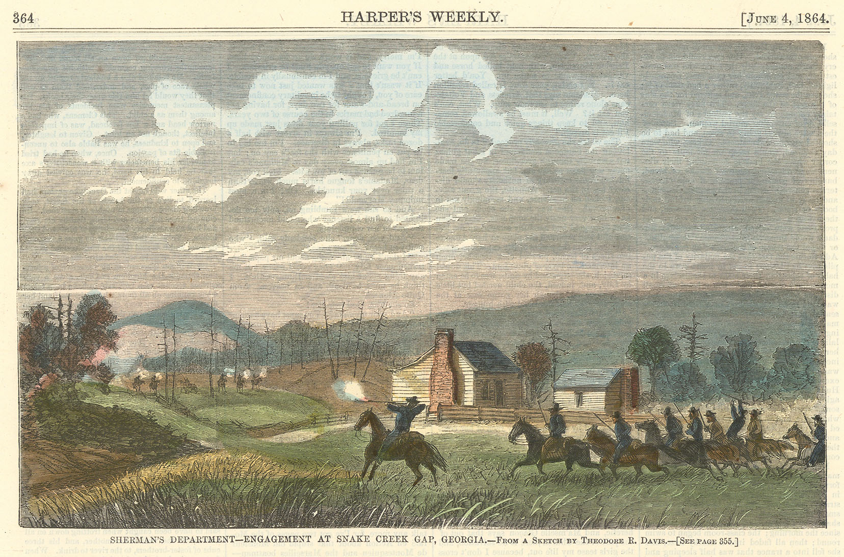DESCRIPTION: Sherman’s Department – Engagement at Snake Creek Gap, Georgia. 1864. Published in Harper’s Weekly. This dramatic wood engraving shows Union forces pushing through Snake Creek Gap during Sherman’s campaign in Georgia. A key move that threatened the Confederate stronghold at Resaca and marked an important step toward the capture of Atlanta.