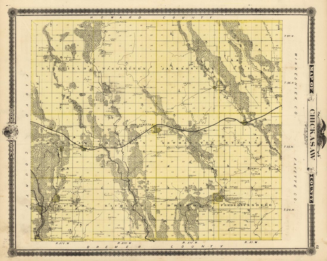 DESCRIPTION: A detailed map from "A. T. Andreas' Historical Atlas of the State of Iowa." On the reverse are six maps of towns, three of which are in the county. They are Nashua, New Hampton and Lawler. Gives many homeowners names. The map is surrounded by a nice decorative border.