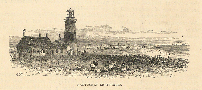 DESCRIPTION: A 19th-century view titled Nantucket Lighthouse, captured as an engraving. <br><br> The lighthouse shown is Sankaty Head Lighthouse before it was moved. Located on Nantucket Island at the easternmost point in the village of Siasconset, the light went into service in 1850, was automated in 1965, and is still in operation. Sankaty Head Light was one of the first lighthouses in the United States to receive a Fresnel lens. The 'Sconset Trust acquired the lighthouse in 2007 and had it moved away from the eroding bluff. The keepers' houses shown in this engraving were torn down and replaced in 1888.