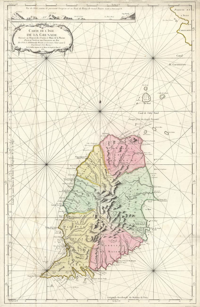 DESCRIPTION: A fine large-scale sea chart of Grenada in the southern windward Islands. Gives great detail of the countors, roads, villages, and ports. Above the decorative title cartouche is a profile showing the coastline from Le Grison to Cap David.