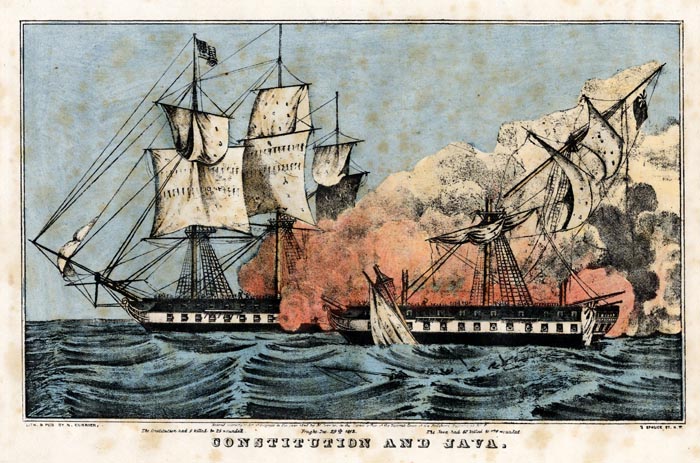 DESCRIPTION: Title continues: The Constitution had 9 killed. Fought Dec. 29th, 1812. The Java had 60 killed and 170 wounded. #403. Second state <> On December 29, , 1812, the USS Constitution under the command of Captain Bainbridge was off the coast of San Salvadore. Bainbridge spotted a British ship closer to shore. The ship was the 38-gun HMS Java commanded by Captain Henry Labert. <br><br> The Java was quicker then the Constitution while the 44-gun Constitution out gunned the Java... The Java was towing an American Merchant ship that it had captured. When it spotted the Constitution, it sent its captured ship into San Salvador Harbor and raced to face the Constitution. At 2 p.m. the two ships were within cannon range. The two sides faced each other with broadsides. <br><br> While the Java initially out maneuvered the Constitution, the latter's larger number of guns and the greater accuracy of its gunnery took a steady toll on the Java. By 3 p.m. Captain Lambert had concluded that his only hope was to board the Constitution. That attempt failed when an accurate broadside struck his ship by the Constitution that brought down his top mast and foremast. By 4:20 p.m. the Java’s main mask fell. An hour later when the Constitution was nearing for another run on the stricken ship, the Java struck her colors and surrendered.