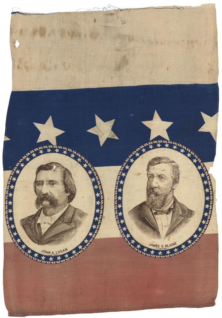 DESCRIPTION: This rare bunting features red, white, and blue stripes with stars in the blue field with the Logan and Blaine portraits printed in brown. The illustration in Threads of History shows Blaine then Logan, while here the order is reversed..<br> <br> The Presidential election of 1884 saw Blaine and Logan running against Democrats Grover Cleveland and Thomas A. Hendricks. The anti-monopoly Greenbacks and the Prohibition Party also ran candidates though neither drew any electoral votes. The election saw a Democrat win the White House for the first time since 1856. Cleveland and Hendricks received 219 electoral votes to Blaine and Logan’s 182. Only slightly over 50,000 votes separated the two parties.