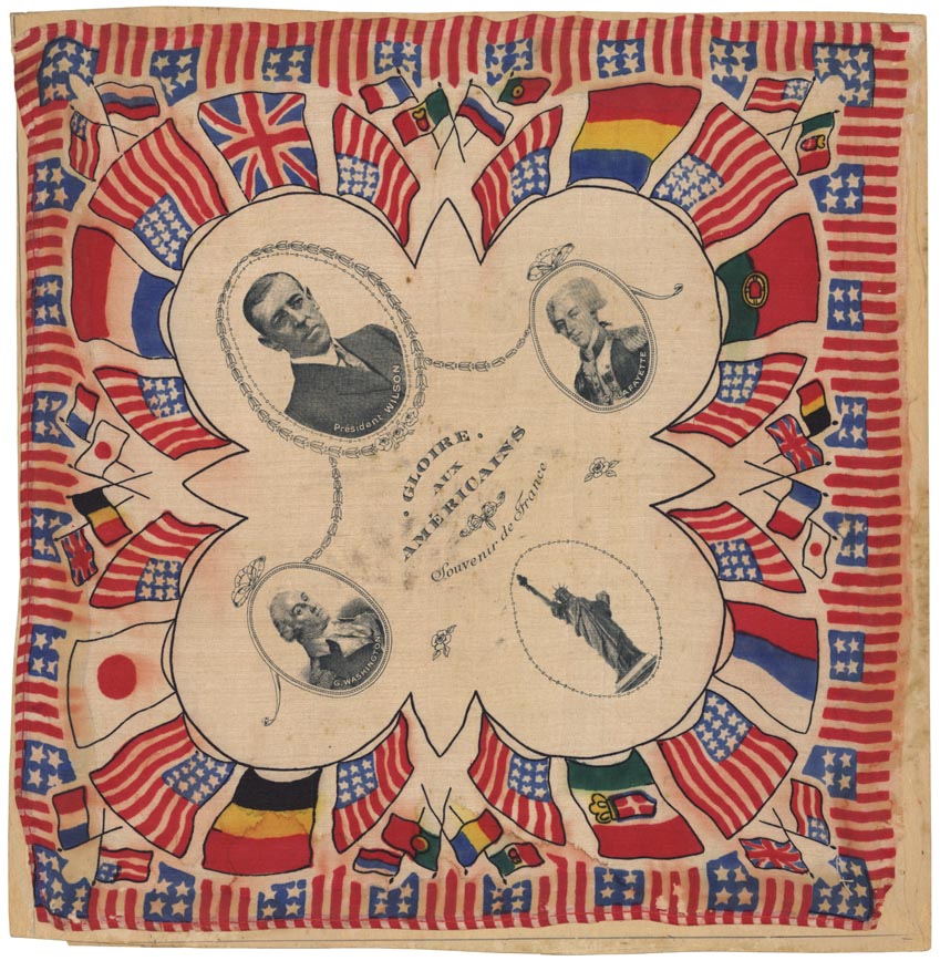 DESCRIPTION: No printer or artist identified. <BR><BR> The kerchief bears an image of the Statue of Liberty and portraits of George Washington, Woodrow Wilson (from a 1910 photograph),, and the Marquis de LaFayette. The portraits are surrounded by flags of foreign nations. <BR><BR> Wilson’s record as President was mixed. He passed the Federal Reserve Act creating the Federal Reserve System, The Federal Trade Commission outlawing unfair methods of competition, and the Clayton Antitrust Act to strengthen the Sherman Antitrust Act and prevent anti-competitive practices. He championed laws prohibiting child labor and limiting the work day for railroad workers to eight hours. He also backed the Eighteenth and Nineteenth Amendments to the United States Constitution. The Eighteenth Amendment outlawed most consumption of alcohol in the United States, and the Nineteenth Amendment gave women the vote. <BR><BR> Wilson had his part in conflicts, and his invasion of Mexico to hunt for Pancho Villa almost caused a full scale war between the United States and Mexico. World War I. however. beckoned and General Pershing was pulled from Mexico and sent to Europe.