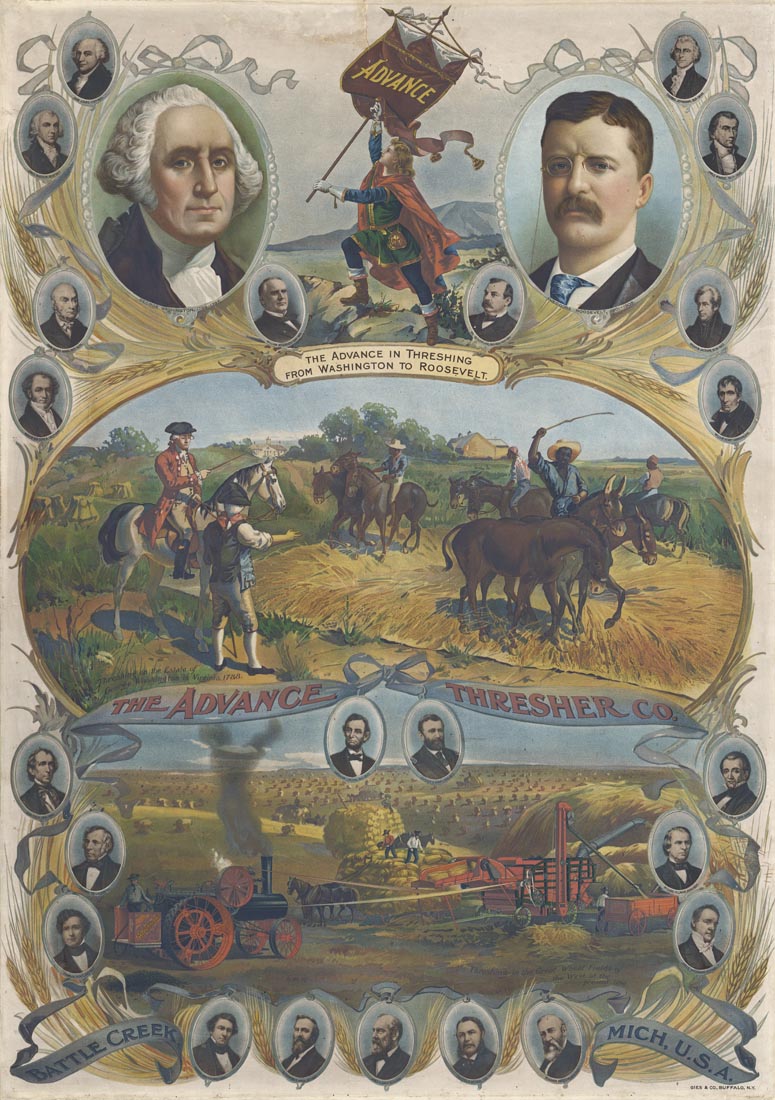 DESCRIPTION: Property of Boston Rare Maps. <BR><BR> A lovely chromolithographic poster by the Advance Thresher Co. of Battle Creek, Michigan, appropriating political imagery to promote farm machinery. <BR><BR> The poster employs a presidential theme highlighting George Washington and Theodore Roosevelt, suggesting that it was produced during the latter’s 1904 re-election campaign. At top large portrait busts of the two presidents flank a figure bearing the “Advance” standard, with smaller busts of the other presidents running around the border. Below the subtitle “The Advance in Threshing from Washington to Roosevelt,” two large vignettes contrast the primitive state of threshing at Mount Vernon with the wonders of the early 20th century. We find but a single other example,, held by the Huntington Library.