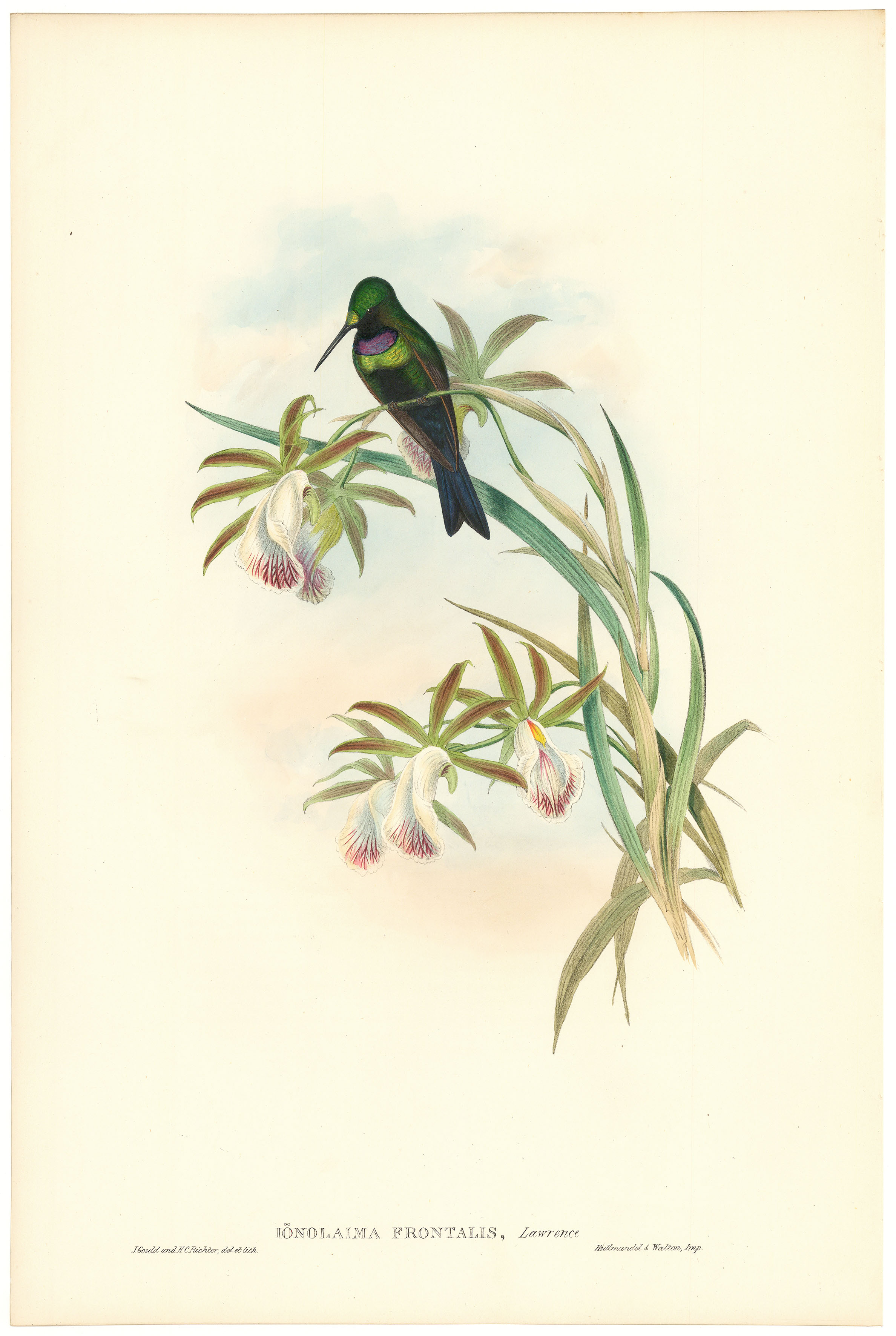 DESCRIPTION: From A Monograph of the Trochilidae, or Family of Humming-Birds, 6 vols., large folio. Published in London, 1849–1887. Printed by Hullmandel and Walter from drawings by J. Gould, H. C. Richter, and William Hart, lithographed by the artists. The Black-throated Brilliant is an elegant Andean species, recognized for its lustrous emerald-green plumage, contrasting velvety black throat, and violet reflections across the crown and breast. In Gould’s hand-colored lithograph, the bird is shown perched gracefully amid tropical flowers, its form rendered with meticulous precision and enhanced by metallic pigments that replicate the iridescent quality of its feathers. The refined composition captures both the bird’s stately presence and the radiant interplay of color that defines the Brilliants as one of the most resplendent groups within the hummingbird family. John Gould’s Monograph of the Trochilidae remains one of the most celebrated works in the history of ornithological illustration. Spanning nearly four decades, the series united Gould’s scientific acumen with the artistry of Henry Constantine Richter and William Hart. The Black-throated Brilliant plate exemplifies their shared mastery—melding naturalistic detail with painterly elegance to immortalize one of the most dazzling jewels of the South American highlands.