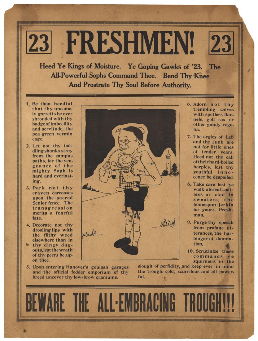DESCRIPTION: Text continues "Heed Ye Kings of Moisture. Ye Gaping Gawks of '23. The All-Powerful Sophs Command Thee. Bend Thy Knee and Prostrate Thy Soul Before Authority. " 10 rules are then listed. Beware the All-Embracing Trough!!!" Central illustration has printed initials "MGE."<br><br> Printed broadside. a warning to the incoming class of freshman