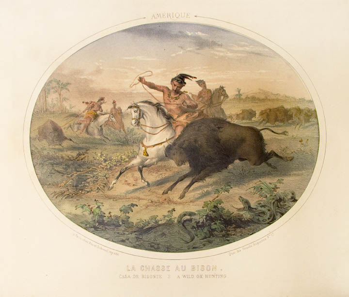 DESCRIPTION: Comments Larry Barsness in The Bison in Art, "This horse looks more like an Arabian charger than an Indian pony, and the buffalo is amazingly spright." Still, it is a dramatic and unusual European rendering of a typical event in Western American life -- an Indian brave about to lasso a charging American buffalo. In the background are other Indian hunters and a herd stampeding across the plains. In the foreground is a large snake.