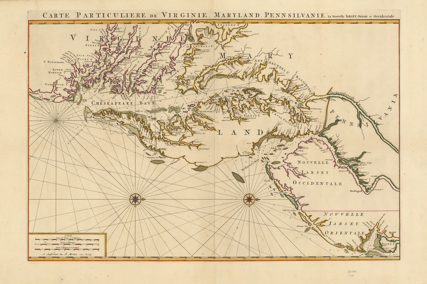 DESCRIPTION: An important and quite beautiful chart of the mid-Atlantic coast line. Shown is an area from Staten Island in New York southward to Carratuck Inlet in North Carolina with the Chesapeake Bay featured prominently. This chart is by A.H. Jaillot, and appeared in the atlas "Suite du Neptune Francois…" This atlas was published by Pierre Mortier for Jaillot. Cartographically, this map is a very close copy of John Thornton & William Fisher's chart of 1689 that appeared in "The English Pilot, The Forth Book," which in turn was largely based on the hugely important and rare Augustine Herrman map. This is a very nice 1st state (of three) example of this scarce chart.
