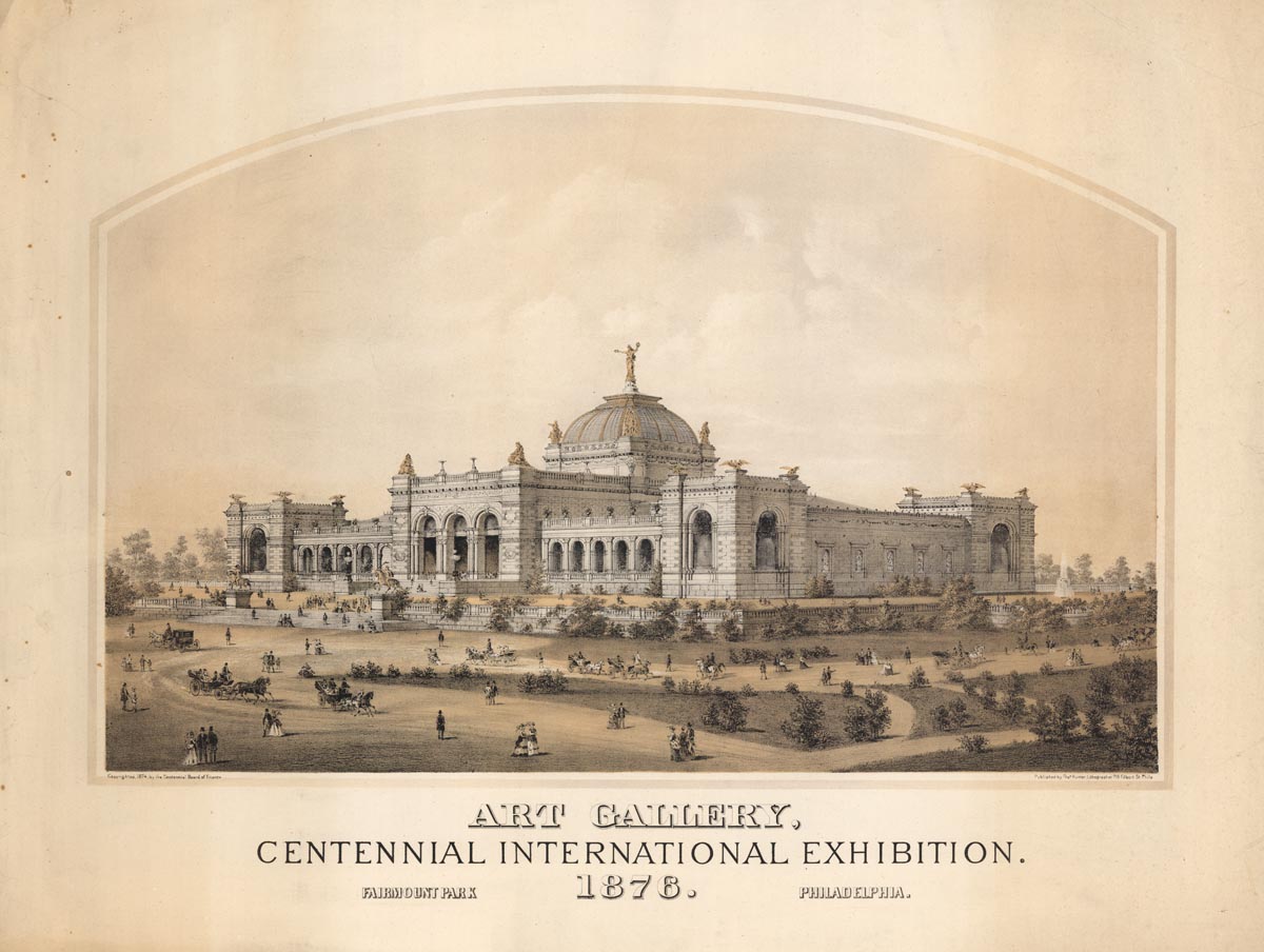 DESCRIPTION: "Fairmount Park, Philadelphia". Copyrighted 1874, by the Centennial Board of Finance. The Centennial International Exhibition of 1876, the first official World's Fair in the United States, celebrated the 100th anniversary of the signing of the Declaration of Independence. The Art Gallery was designed in the beaux-arts style by Herman J. Schwarzmann. Now known as "Memorial Hall", the building still stands and has housed - over the years - a school of industrial art, a gymnasium, swimming pool, police station, and its current occupant - a children's museum.