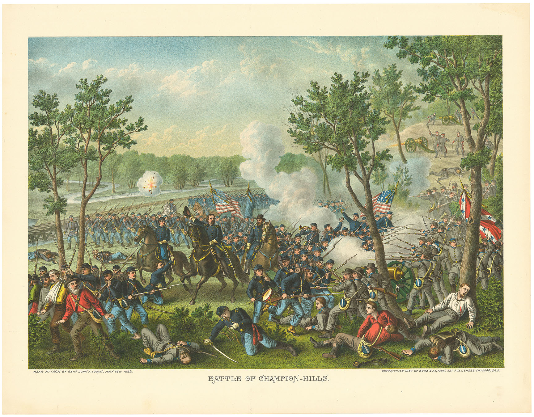 DESCRIPTION: Subtitled - "Rear Attack by Genl. John A. Logan - May 16th 1863". A Union victory. This battle was key in the isolation and eventual siege of the city of Vicksburg. Between 1884 and 1894 Kurz and Allison published thirty-six chromolithographs of Civil War battles. These prints were valued for their naive artistry. The compositions are stylized, showing both Union and Confederate armies in panoramic "fishbowl" settings. This, together with an unpainterly treatment of human figures, lends an effect similar to the graphics seen in the earlier lithography of Currier & Ives.