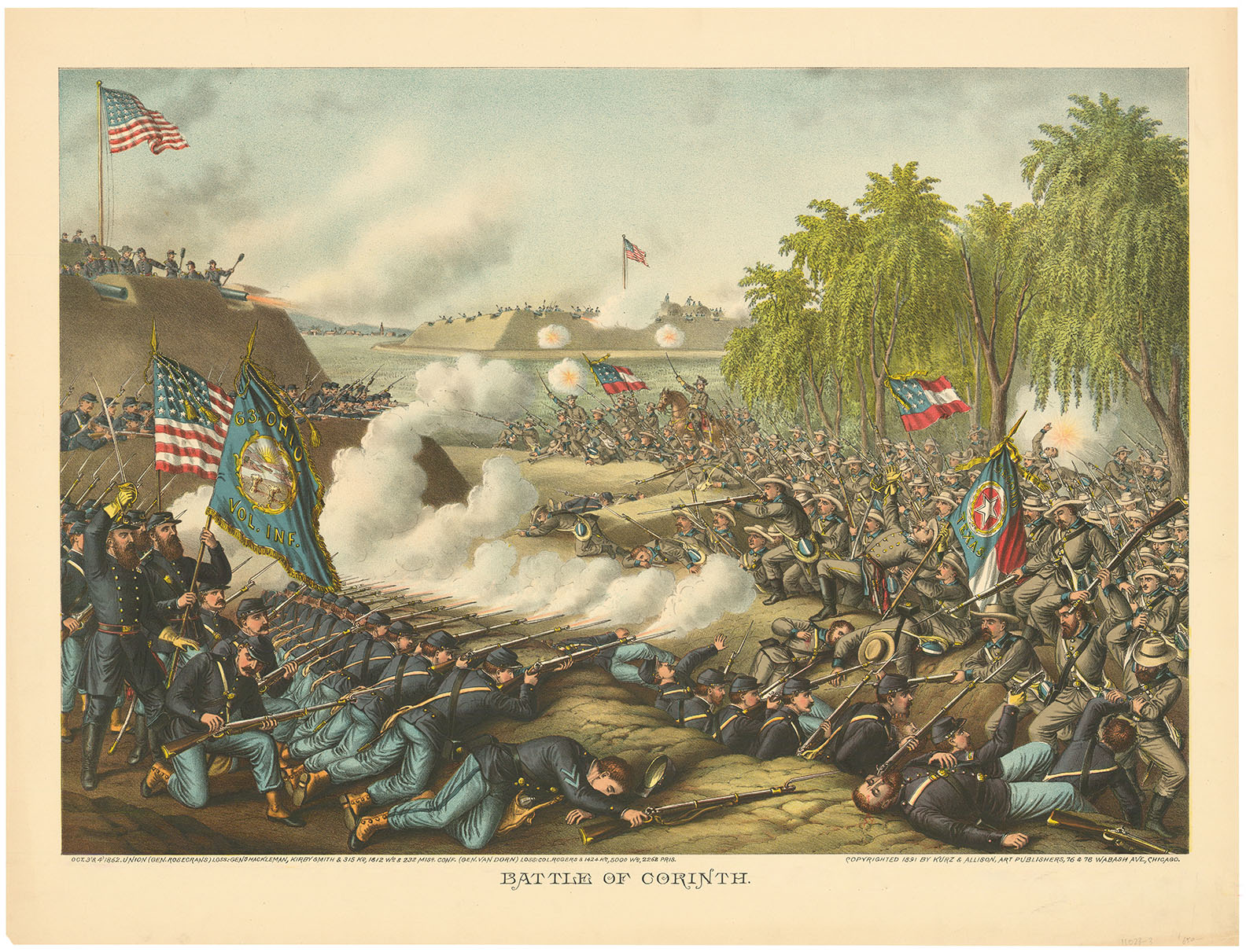DESCRIPTION: Subtitled “Oct. 3 & 4, 1862. Union (Gen. Rosencrans) Loss: Gens. Hackleman, Kirby Smith & 315 Kd., 1812 Wd. & 232 Misg. Conf. (Gen. Van Dorn) Loss: Col. Rogers & 1424 Kd., 5000 Wd., 2268 Pris.” In the foreground, the 2nd Texas Infantry Regiment is shown attacking the 63rd Ohio Volunteer Infantry. Issued between 1884 and 1894, this print is part of the series of thirty-six Civil War battle scenes published by Kurz & Allison. Their chromolithographs were prized for their vivid if somewhat naive artistry—stylized panoramas of Union and Confederate forces rendered in “fishbowl” compositions, with figures treated in a manner reminiscent of the earlier popular lithographs of Currier & Ives.