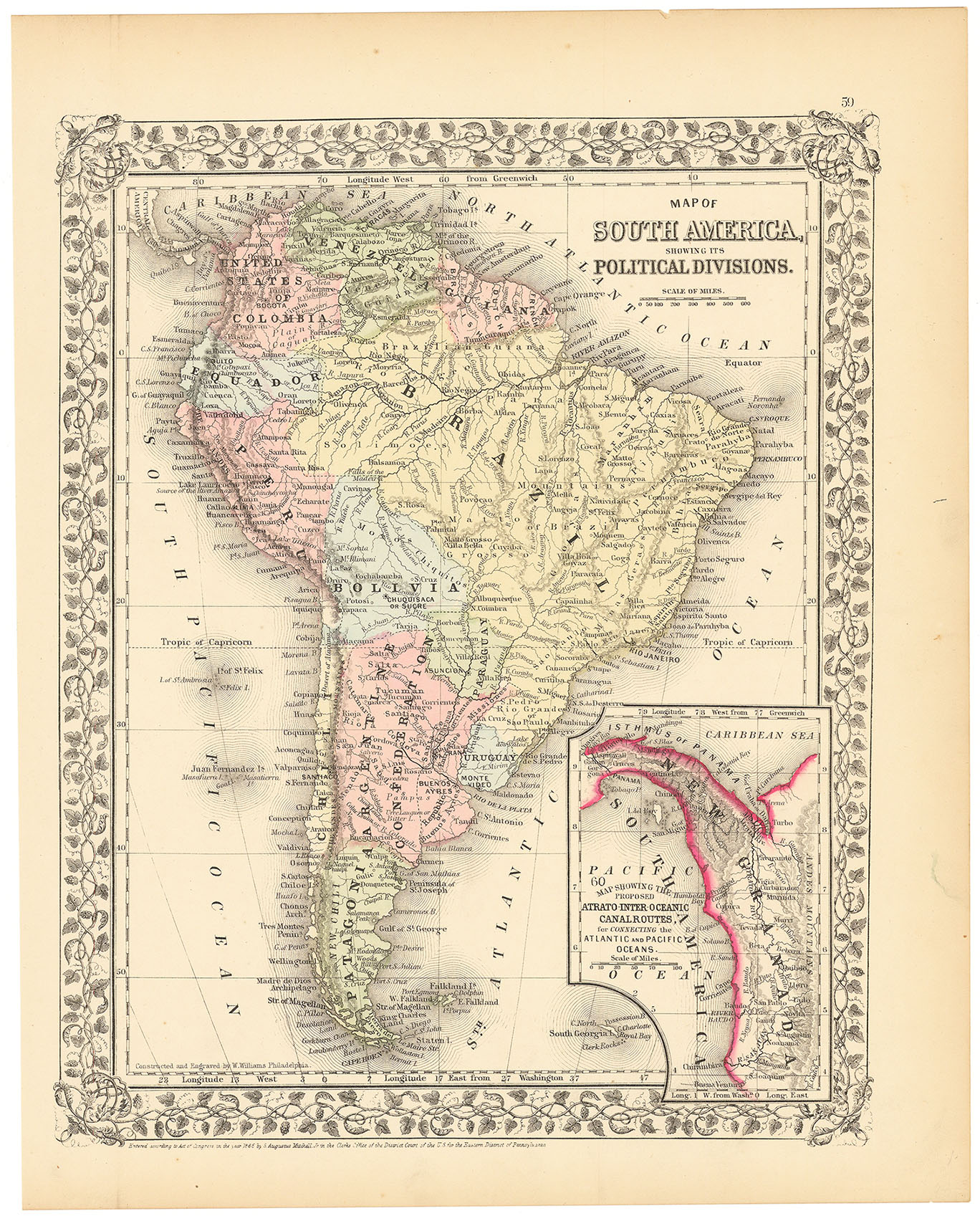 DESCRIPTION: From "Mitchell's New General Atlas,…". Nicely embellished with a Grape vine border. The inset in the lower right shows the proposed Panama Canal or "Atrato-Inter-Oceanic Canal Routes".