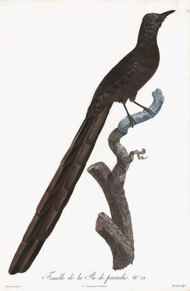 DESCRIPTION: 'Peree sculp.' This plate appeared in "Histoire Naturelle des Oiseaux de Paradis et des Rolliers, Suivie de Celle des Toucans et des Barbus" Published in Paris by Francois Levillant. The artist of this work, Jacques Barraband, was one of the premier zoological and botanical illustrators working during the early 19th century. Printed by Rousset - one of a select few who could print a la poupee, a process using different colored inks to selectively ink a printing plate. The print was then finished with hand coloring. It is a tedious and time-consuming process but the results were well worth the effort.