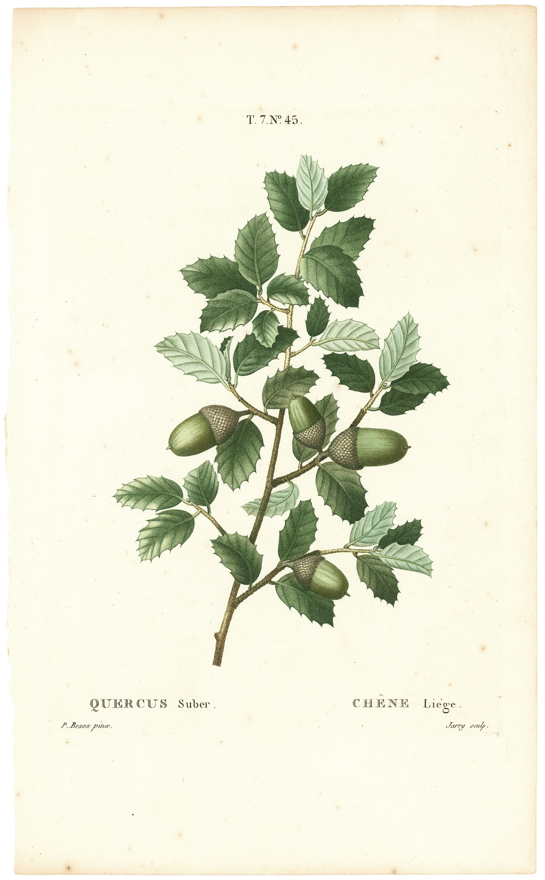 DESCRIPTION: Quercus Suber: Chene Liege [Acorns] From Traite des Arbres et Arbustes by Henri-Louis Duhamel du Monceau, published in Paris, 1800–1825. Drawn by Pancrace Bessa, a disciple and associate of Pierre Joseph Redoute, the celebrated French flower painter. This finely engraved plate depicts the acorns of the cork oak (Quercus suber), a Mediterranean species valued both for its fruit and for the thick, rugged bark harvested as cork.