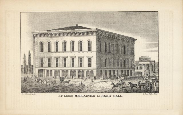 DESCRIPTION: R. S. Mitchell Archt. From John Hogan's "Thoughts about the City of St. Louis, Her Commerce and Manufactures, Railroads, etc. Published by Republican Steam Press Print., St. Louis. The original Mercantile Library in downtown St. Louis. The Mercantile Library is now located at the University of St. Louis.