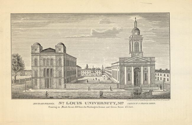 DESCRIPTION: Saint Louis University is a private Roman Catholic four-year research university that was founded in 1818 by the Most Reverend Louis Guillaume Valentin Dubourg, It is the oldest university west of the Mississippi River and the second-oldest Jesuit university in the United States. From John Hogan's "Thoughts about the City of St. Louis, Her Commerce and Manufactures, Railroads, etc. Published by Republican Steam Press Print., St. Louis.