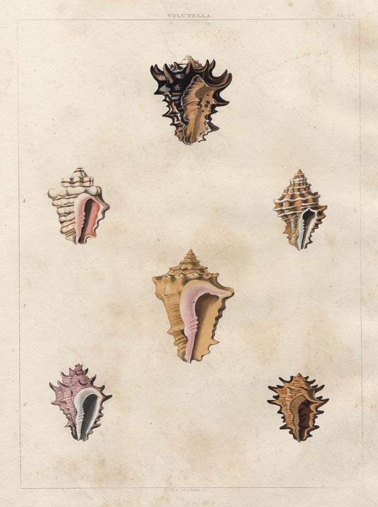 DESCRIPTION: A fine plate from Perry's "Conchology, or the Natural History of Shells." This series is best known for its large-sized and beautifully colored engravings. Engraved and colored after the original drawings by John Clarke.