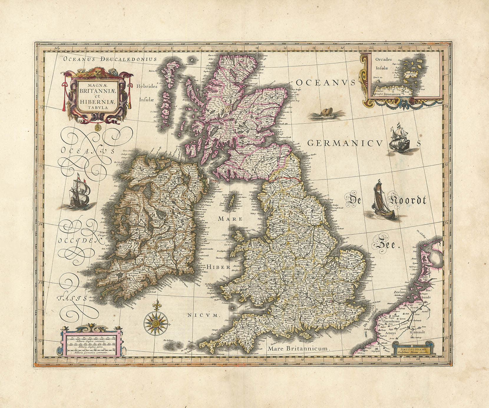 DESCRIPTION: A beautiful map from a 1640 Latin text edition of Joan Blaeu's "Theatrum Orbis Terrarum, Sive Atlas Novis."<br><br> Joan Blaeu was the son of Willem Janszoon Blaeu, who founded a famous cartographic firm in Amsterdam with his two sons during the 17th century, the golden age of the Dutch school of cartography. Willem and Joan published the first edition of their atlas, “Theatrum Orbis Terrarum,” in 1630 with a version of this map included. They continued to publish later editions until Willem’s death in 1638. After his father’s death, Joan expanded and revised the atlas alone, adding more volumes and creating new editions such as this one from 1640. His efforts culminated in the production of the Atlas Maior, the largest book produced in the 17th century, which was produced between 1662 and 1672 in editions containing up to 12 volumes.<br><br>This particular map was the Blaeus’ standard and most iconic representation of the British Isles, and it appeared in all of the versions of the atlas, from 1630 to 1672. It is notable for its comprehensive depiction of England, Scotland, Wales, and Ireland, and also includes parts of coastal France and Holland and an inset of the Orkney Islands. Regions, towns, ports, and islands in the British Isles are labeled in great detail. This is a decorative example of the map, produced before it was reformatted for use in the Atlas Maior, and includes a title cartouche, compass rose, sailing ships, and a sea monster.
