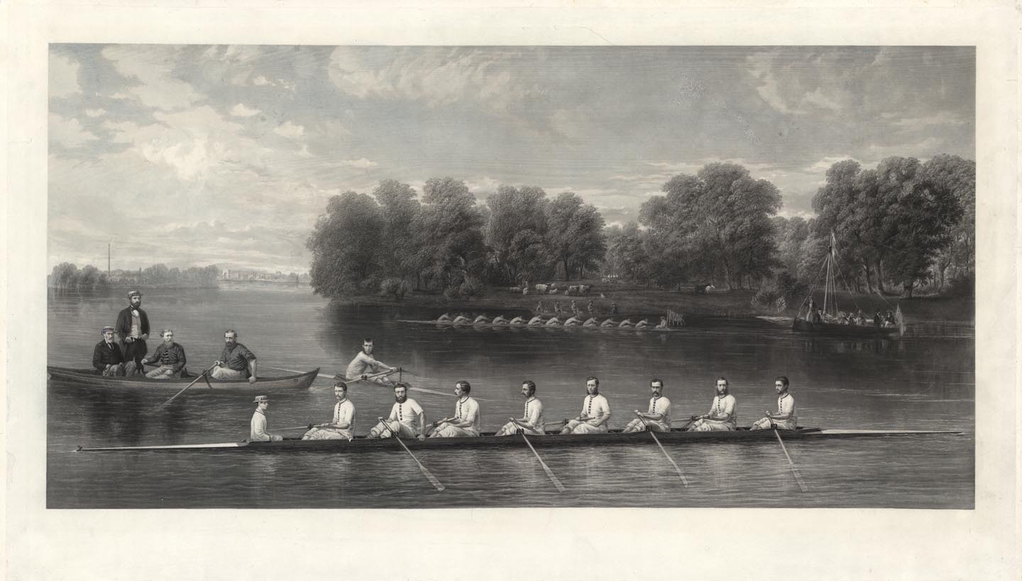 DESCRIPTION: No artist, engraver or publisher's name given. <br><br> The 1857 winning crew and founders of the newly formed London Rowing Club. Herbert Playford is the stroke the eight in the foreground with the rest of the crew being F. Potter, J. Paine, J. Nottidge, W. Farrer, J. Ireland, C. Schlotel & A.A. Casamajor with H. Edie, the Cox. Francis Playford is standing in the boat on the left. Alexander A. Casamajor, one of the greatest scullers of the day, is also shown in the single boat.. He won the Wingfield Sculls for six successive years.<br><br> In the background are coaches, spectators and a 12-oar boat.