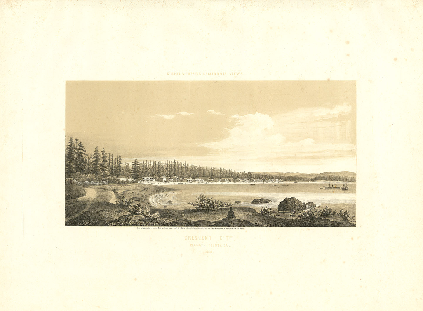 DESCRIPTION: Crescent City is on the far northern coast of California and now located in Del Norte County.<br><br> The view shows the newly settled Crescent City, established in 1853, surrounded by tall pines and a few dozen buildings. Two small steamers are at anchor in the bay. The Klamath Mountains are visible in the background. In the foreground is a gentleman sitting on the shoreline. This is likely the artist. It was very common for an artist to draw himself into the scene during the period.<br><br> This view was issued in two versions, this example with the additional title “Kuchel & Dresels California Views” above the image. It was also issued with the main image surrounded by closeup images of local buildings found in the town. It is likely that the version with the surrounding view was done later, perhaps as a 2nd state or edition.<br><br> Charles C. Kuchel & Emil Dresel were among the earliest western view makers. The pair published approximately fifty views between 1855 and 1859, of which forty-one were of California, seven were of Oregon and the others were of towns located in Washington and Nevada. Most were printed by Britton & Re of San Francisco.<br><br>