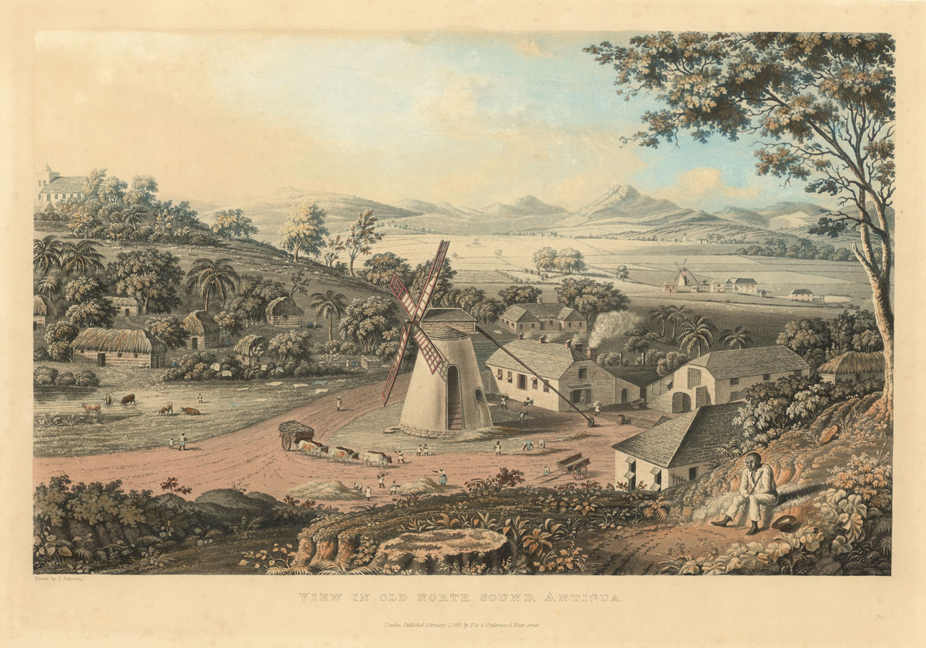 DESCRIPTION: Drawn by J.Johnson. This beautiful image shows the mill yard and sugar works on the estate of Captain Freeman.<br><br> In the background are other plantation and the Monks Hill fortifications in the background on top of the left peak. On the left of the picture can be seen a chapel built by the Moravian missionaries in the grounds of Samuel Otts' estate.