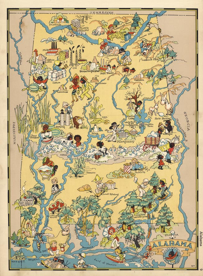 DESCRIPTION: This fascinating pictorial map was published in 1935 by the famous cartographer & illustrator, Ruth Taylor (White). It appeared in "Our U.S.A - A Gay Geography," with the maps done by Ruth Taylor and the text by her husband Frank Taylor. These maps are bold, colorful, and are fun to study. They give a local color and flavor giving cultural stereotypes, industries and activities in the state.