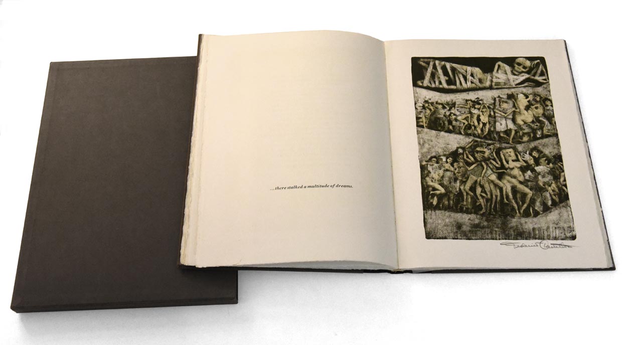 DESCRIPTION: Edgar Allen Poe, illustrated by Federico Castellon. 70 pages, 16 color lithographs, all signed in pencil by the artist. Folio, brown & black linen with gilt stamped spine. In slip case. Signed in ink on the colophon page.<br><br> From the colophon:<BR> "This edition of The Mask of the Red Death is the first publication of the Aquarius Press. The text is set as it appeared in the first edition, published in Graham's Magazine in 1842. There are 500 copies in the principal edition, numbered and signed by the artist on this page. A special edition of twenty-five copies numbered I-XXV contains an additional suite of the 16 color lithographs, signed and without text, plus six additional original color lithographs created as marginalia, all individually signed. Ten copies of the regular edition numbered, A-J are reserved for the collaborators.<BR><BR> The lithographs were drawn on the stones by Federico Castellon and printed under his supervision at the Atelier of Edmund and Jacques Desjobert in Paris, France, on Rives BFK paper, in 1968. The book is designed by Bert Clarke and the text set in Monotype Walbaum and printed by Clarke & Way in New York City. The binding is by Russell Rutter Company. <BR><BR> Editorial direction: John Ross and Jacob Landau."