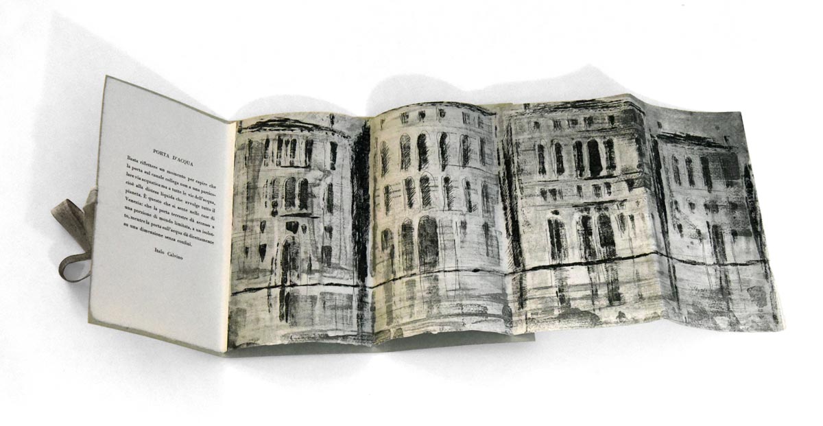 DESCRIPTION: Fold out etching and aquatint. Edition of 12. Thick paper exterior with ribbon tie. Colophon is printed on verso. Singed in pencil on the colophon. Inscribed "2" in pencil. <br><br> The text inside is an excerpt from Italian writer and journalist Italo Calvino, "Porta D'Acqua : Basta riflettere un momento per capire che la porta sul canale collega non a una particolare via acquatica ma a tutte le vie dell'acqua, cioe alla distessa liquida che avvolge tutto il pianeta. E questo che si sene nelle case di Venezia: che la porta terrestre da accesso a una przione di mondo limitata, a un isoltto, mentre la porta sull'acqua da direttamente su una dimensione senza confini. "