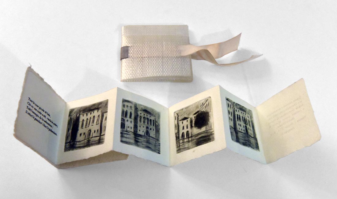 DESCRIPTION: A small 3x3" (7.2 x 7.2 cm) accordion-fold book. Contains 4 original drypoints of Venice, Italy, an introductory description, and a colophon page. Comes in a woven plastic portfolio that ties with a ribbon. <br><br>