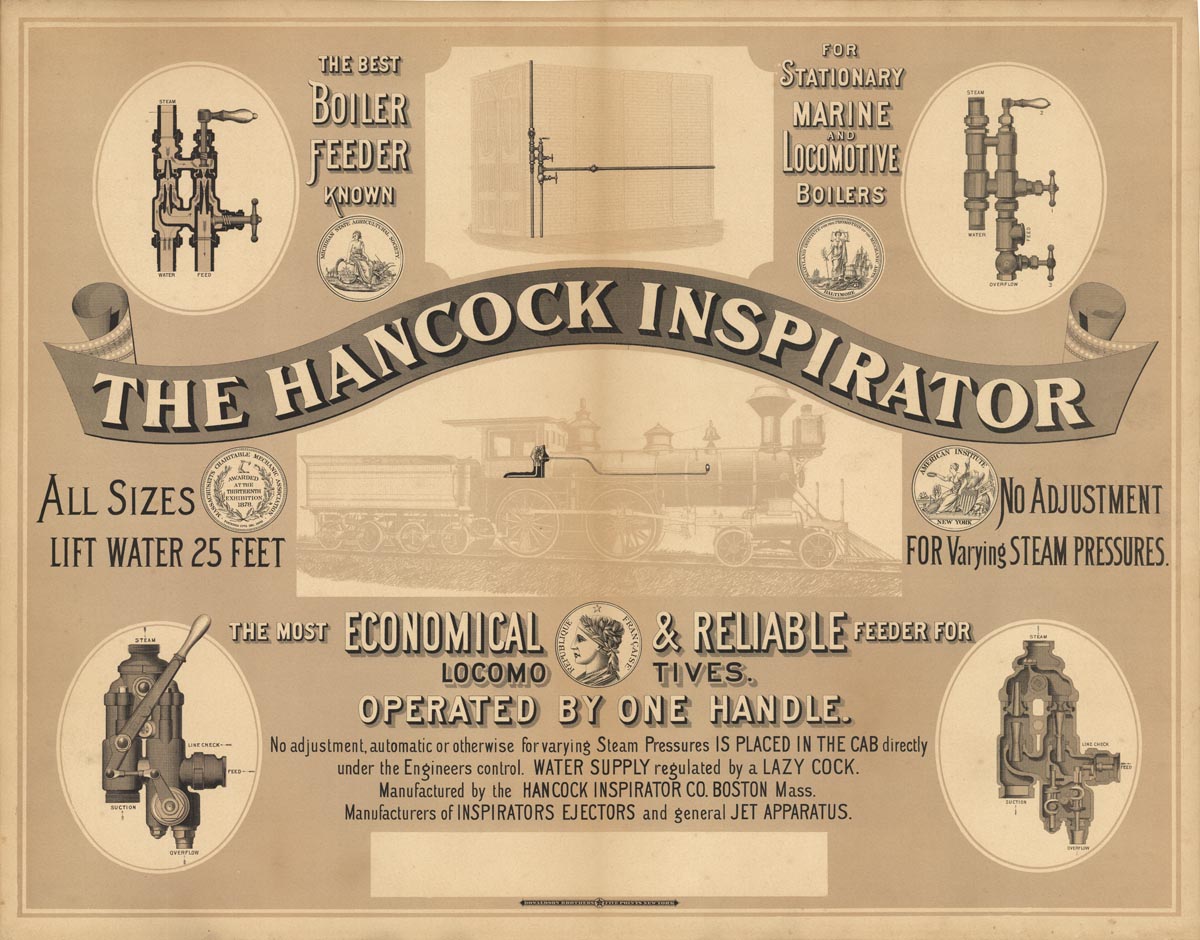 • DESCRIPTION: Additional text reads, "Operated by one handle. No adjustment, automatic or otherwise for varying Steam Pressures IS PLACED IN THE CAB directly under the Engineers control. WATER SUPPLY regulated by a LAZY COCK. Manufactured by the HANCOCK INSPIRATOR CO. BOSTON Mass. Manufacturer of INSPIRATORS EJECTORS and general JET APPARATUS." <br><br> Printed by the Donaldson Brothers. Five Points, New York.
