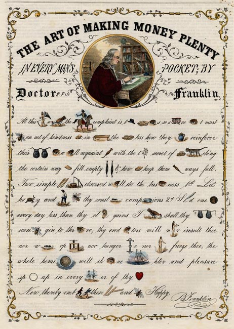 DESCRIPTION: This rebus is based on Benjamin Franklin’s proverbs used in “Poor Richard’s Almanack.” Translated, this rebus reads, “At this time when the general complaint is that money is so scarce it must be an act of kindness to inform the moneyless how they can reinforce their pockets. I will acquaint all with the true secret of money catching, the certain way to fill empty purses and how to keep them always full. Two simple rules well observed will do the business: 1st. Let honesty and labor be thy constant companions. 2nd. Spend one penny every day less than thy clear gains. Then shall thy pockets soon begin to thrive, thy creditors will never insult thee, nor want to oppress, nor hunger bite, nor nakedness freeze thee. The whole hemisphere will shine brighter, and pleasure spring up in every corner of thy heart. Now thereby embrace these rules and be Happy.”
