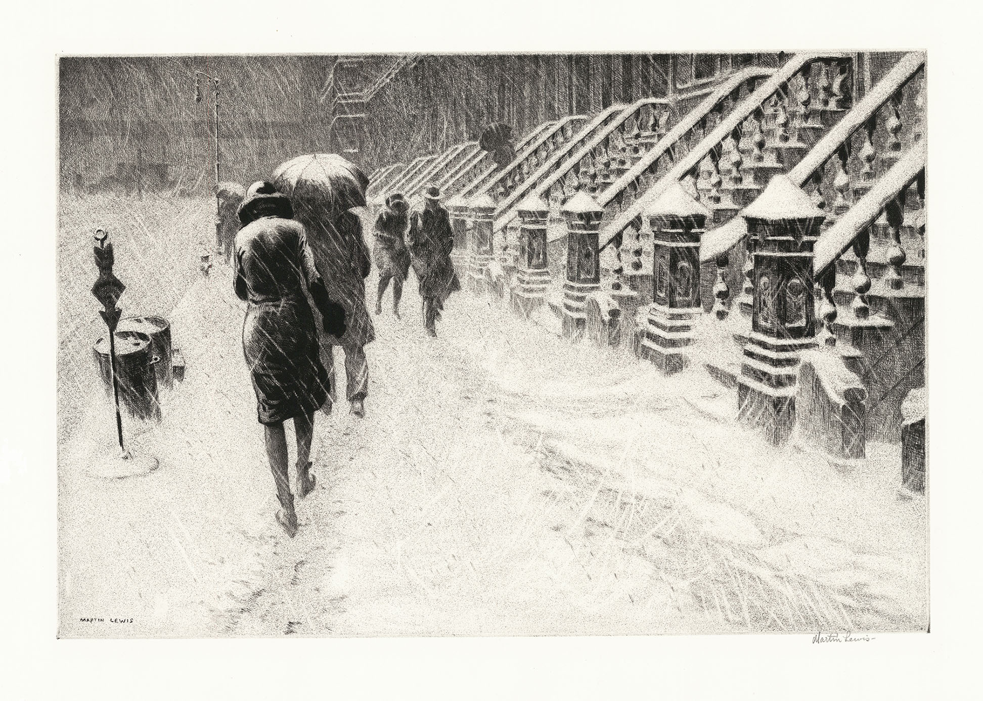 DESCRIPTION: A rejected title was" Stoops in Snow-West Forties." However, the image is likely in the Thirties (Thirty-fifth to Thirty-eighth Streets) looking east with the Third Avenue El in the background.